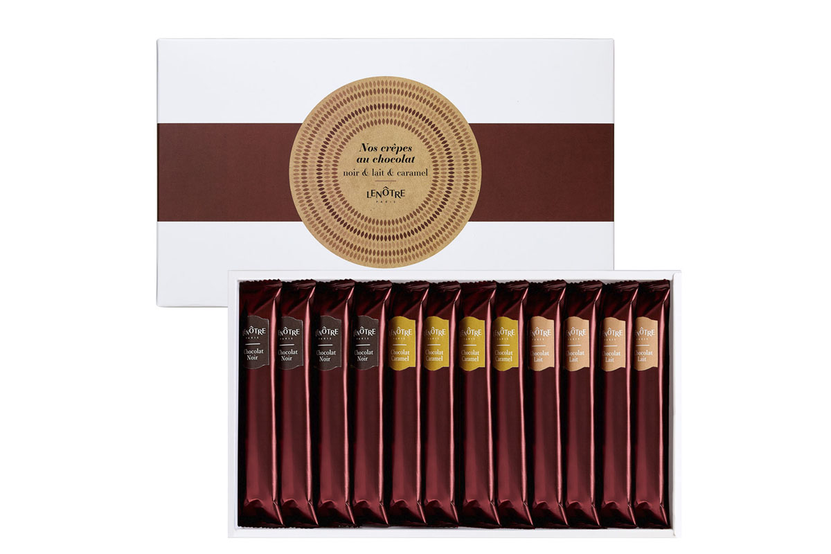 クレープ・ショコラ・キャラメル - 繊細なクレープ生地を塩バターキャラメル風味のホワイトチョコレートで包んだ、 控えめな甘さとミルキーな味わい。