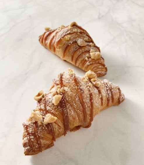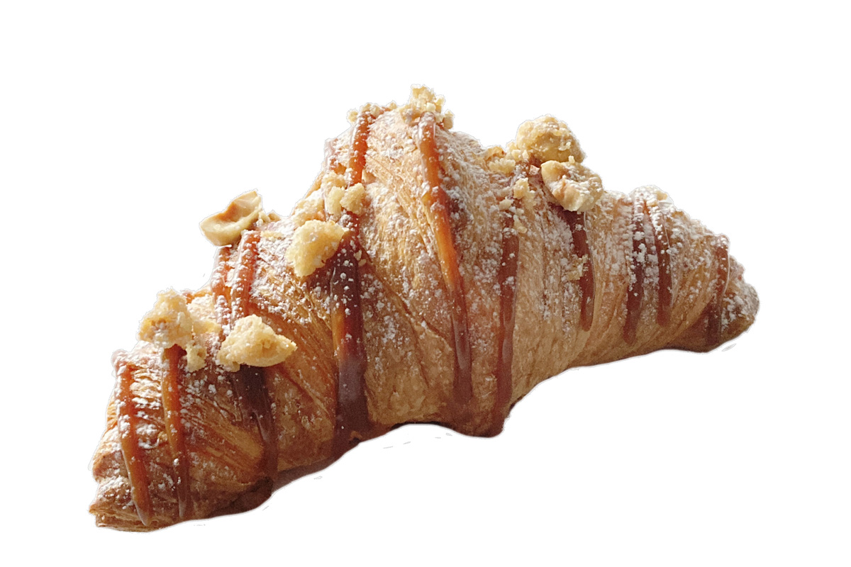 濃厚なキャラメルをまとわせ、サクサクと香ばしいヘーゼルナッツのクランブルをのせ、中にはヘーゼルナッツのプラリネを忍ばせました。 ナッツの香り高い贅沢なクロワッサンに仕上がっています。
