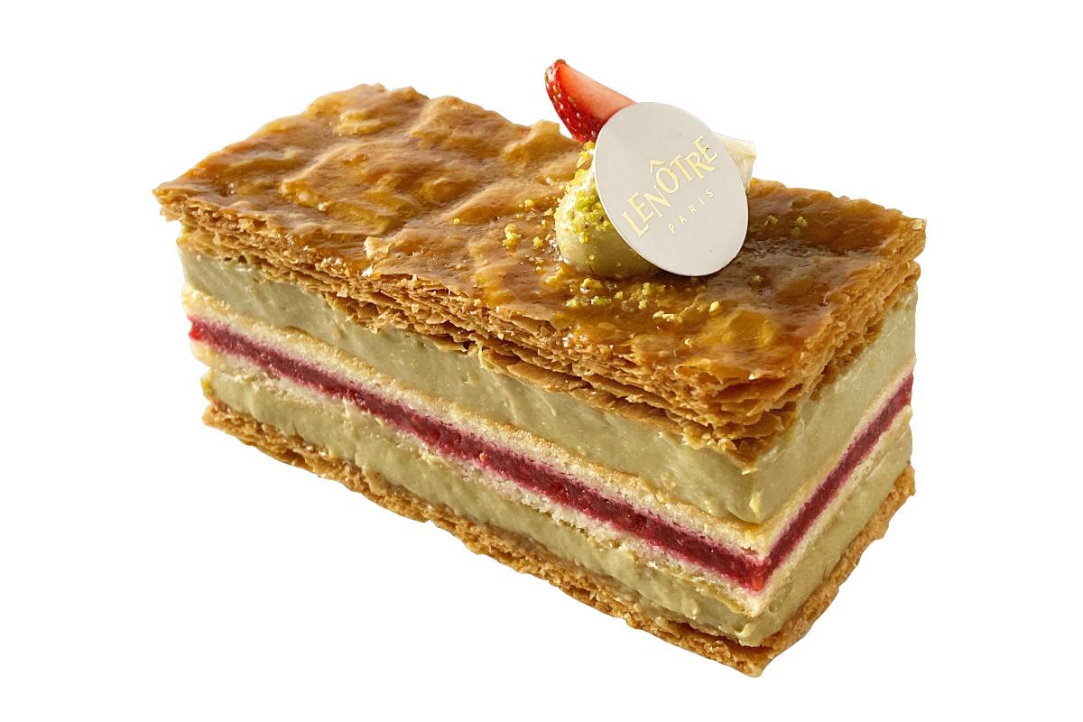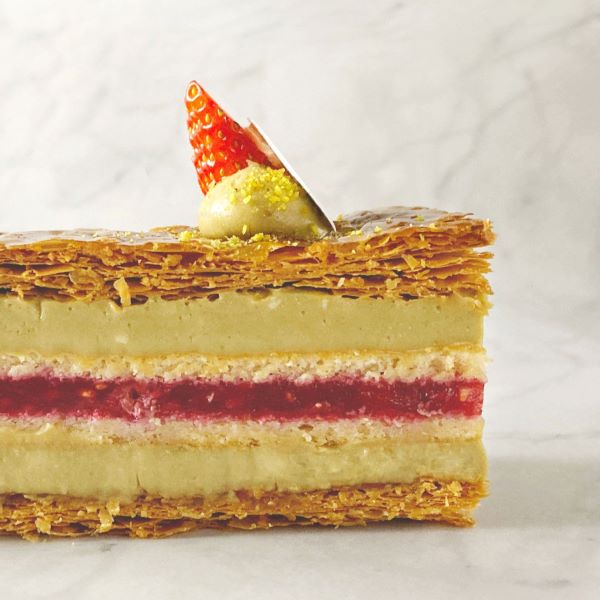 表面をキャラメリゼした香ばしくサクサクとした食感のパイ生地と、濃厚なピスタチオクリーム、軽やかな酸味のイチゴとフランボワーズのジュレ、しっとり食感のアーモンド風味のビスキュイを贅沢に重ね合わせました。