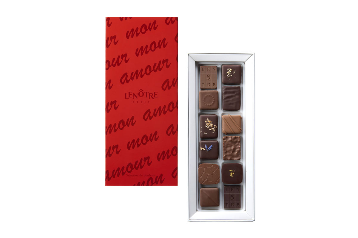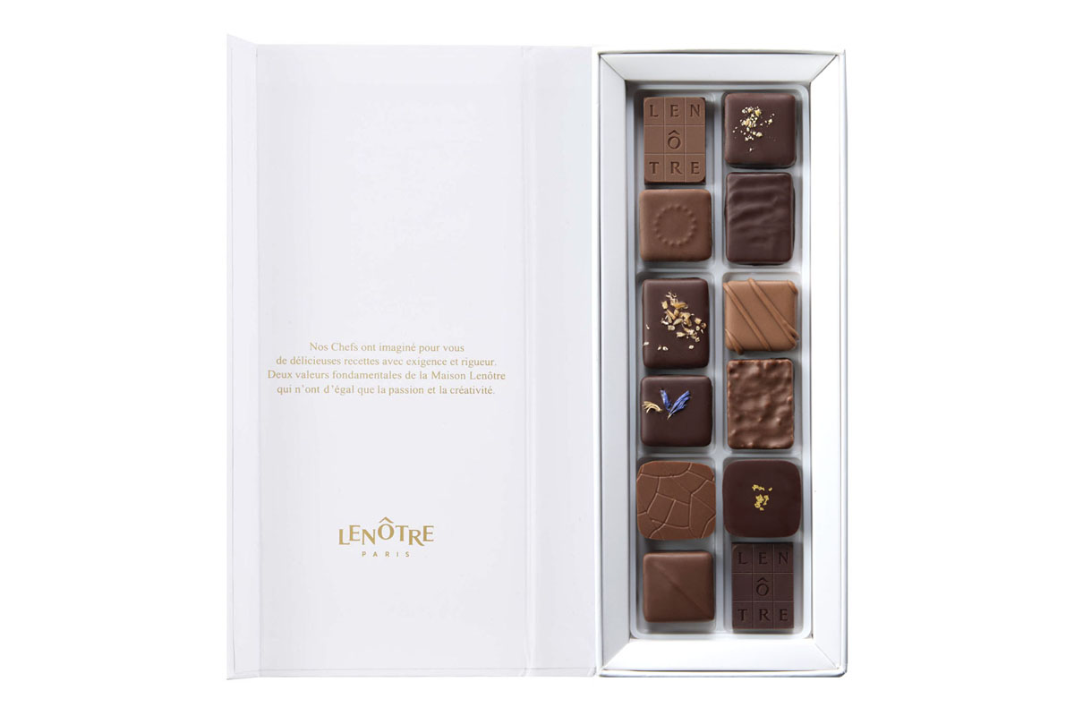 ルノートルが誇る繊細で豊かな風味の世界を堪能できる「アマンド・ココ」、「カフェ・モカ」、「コリアンダー・シトロン」、「ショコラ・オ・レ&プラリネ」のプラリネ4種、「ピスターシュ・グリオット」、「パプア」、「アールグレイ」、「キャラメル・フルール・ドゥ・セル」のガナッシュ4種の新作8種に、定番の4種を合わせたルノートルの伝統と技術が詰まったショコラ12種をお楽しみください。